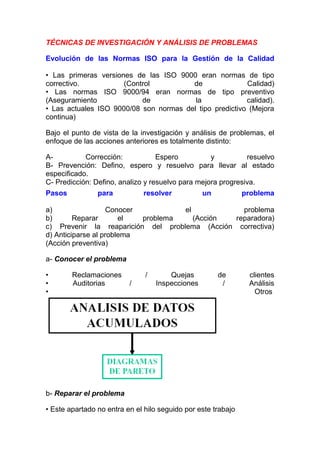 Este documento describe diferentes técnicas de investigación y análisis de problemas como el diagrama de causa-efecto, la tormenta de ideas y el diagrama de Pareto. Explica que el diagrama de causa-efecto ilustra las causas de un proceso y cómo están relacionadas, la tormenta de ideas ayuda a generar muchas ideas en poco tiempo, y el diagrama de Pareto prioriza problemas según su importancia. Además, provee un ejemplo práctico de cómo aplicar estas técnicas para analizar las causas de un resultado