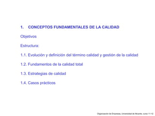Este documento describe la evolución histórica de la calidad y su definición, desde la inspección en el siglo XX hasta la gestión de la calidad actual centrada en la prevención y satisfacción del cliente. También resume los fundamentos de la calidad total, incluyendo sus beneficios, y las estrategias de calidad como la certificación y premios.