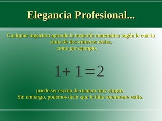 El documento comienza explicando que los ingenieros aprenden la simple notación matemática de la suma de dos números reales, como 1 + 1 = 2. Luego, procede a "reescribir" esta ecuación de manera cada vez más compleja usando diferentes símbolos y conceptos matemáticos avanzados, aunque en realidad no aporta nada nuevo. El propósito es demostrar de manera humorística que los ingenieros también pueden complicar las cosas sin necesidad y que en la práctica las cosas suelen ser más simples que en la teoría.