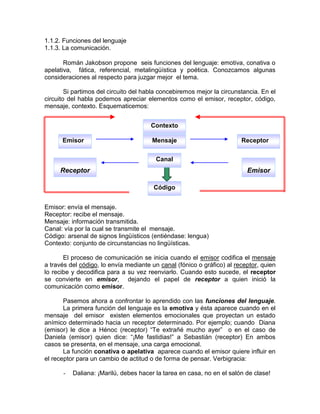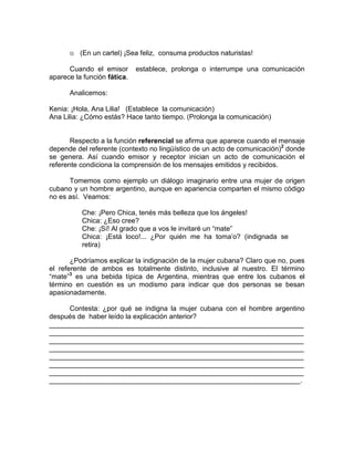 1.1.2. Funciones dellenguaje<br />1.1.3. La comunicación.<br />Román Jakobson propone seis funciones del lenguaje: emotiva, conativa o apelativa, fática, referencial, metalingüística y poética. Conozcamos algunas consideraciones al respecto para juzgar mejor el tema. <br />Si partimos del circuito del habla concebiremos mejor la circunstancia. En el circuito del habla podemos apreciar elementos como el emisor, receptor, código, mensaje, contexto. Esquematicemos:<br />Contexto<br />ReceptorMensajeEmisor<br />EmisorReceptorCanal<br />Código<br />Emisor: envía el mensaje.<br />Receptor: recibe el mensaje.<br />Mensaje: información transmitida.<br />Canal: vía por la cual se transmite el mensaje.<br />Código: arsenal de signos lingüísticos (entiéndase: lengua)<br />Contexto: conjunto de circunstancias no lingüísticas.<br />El proceso de comunicación se inicia cuando el emisor codifica el mensaje a través del código, lo envía mediante un canal (fónico o gráfico) al receptor, quien lo recibe y decodifica para a su vez reenviarlo. Cuando esto sucede, el receptor se convierte en emisor, dejando el papel de receptor a quien inició la comunicación como emisor.<br />Pasemos ahora a confrontar lo aprendido con las funciones del lenguaje. La primera función del lenguaje es la emotiva y ésta aparece cuando en el mensaje del emisor existen elementos emocionales que proyectan un estado anímico determinado hacia un receptor determinado. Por ejemplo; cuando Diana (emisor) le dice a Hénoc (receptor) “Te extrañé mucho ayer” o en el caso de Daniela (emisor) quien dice: “¡Me fastidias!” a Sebastián (receptor) En ambos casos se presenta, en el mensaje, una carga emocional.<br />La función conativa o apelativa aparece cuando el emisor quiere influir en el receptor para un cambio de actitud o de forma de pensar. Verbigracia:<br />Daliana: ¡Marilú, debes hacer la tarea en casa, no en el salón de clase!<br />(En un cartel) ¡Sea feliz, consuma productos naturistas!<br />Cuando el emisor establece, prolonga o interrumpe una comunicación aparece la función fática. <br /> <br />Analicemos:<br />Kenia: ¡Hola, Ana Lilia! (Establece la comunicación)<br />Ana Lilia: ¿Cómo estás? Hace tanto tiempo. (Prolonga la comunicación)<br />Respecto a la función referencial se afirma que aparece cuando el mensaje depende del referente (contexto no lingüístico de un acto de comunicación)2 donde se genera. Así cuando emisor y receptor inician un acto de comunicación el referente condiciona la comprensión de los mensajes emitidos y recibidos.<br />Tomemos como ejemplo un diálogo imaginario entre una mujer de origen cubano y un hombre argentino, aunque en apariencia comparten el mismo código no es así. Veamos:<br />Che: ¡Pero Chica, tenés más belleza que los ángeles!<br />Chica: ¿Eso cree?<br />Che: ¡Sí! Al grado que a vos le invitaré un “mate”<br />Chica: ¡Está loco!... ¿Por quién me ha toma’o? (indignada se retira)<br />¿Podríamos explicar la indignación de la mujer cubana? Claro que no, pues el referente de ambos es totalmente distinto, inclusive al nuestro. El término “mate”3 es una bebida típica de Argentina, mientras que entre los cubanos el término en cuestión es un modismo para indicar que dos personas se besan apasionadamente.<br />Contesta: ¿por qué se indigna la mujer cubana con el hombre argentino después de haber leído la explicación anterior?<br />_______________________________________________________________________________________________________________________________________________________________________________________________________________________________________________________________________________________________________________________________________________________________________________________________________________________________________________________________________________________________________________________________________________.<br />Ahora, avoquémonos al análisis de la función metalingüística. Esta función aparece cuando el mensaje está centrado en el código empleado entre emisor y receptor. <br />Si alguno de nosotros departiera con una persona, quien no haya concluido la primaria, y charlara sobre las funciones del lenguaje (¡vaya ironía!) La comunicación sería imposible porque el código empleado es totalmente distinto.<br />Por último tenemos la función poética, la cual aparece cuando le damos mayor importancia a la estructura del mensaje, es decir; cuando hacemos uso de figuras retóricas del pensamiento para construir el mensaje. Empero, no es exclusiva de la poesía esta función. Analicemos el siguiente ejemplo:<br />LOS AMOROSOS<br />Los amorosos callan. El amor es el silencio más fino, el más tembloroso, el más insoportable. Los amorosos buscan, los amorosos son los que abandonan, son los que cambian, los que olvidan. Su corazón les dice que nunca han de encontrar, no encuentran, buscan. <br />Los amorosos andan como locos porque están solos, solos, solos, entregándose, dándose a cada rato, llorando porque no salvan al amor. Les preocupa el amor. Los amorosos viven al día, no pueden hacer más, no saben. Siempre se están yendo, siempre, hacia alguna parte. Esperan, no esperan nada, pero esperan. Saben que nunca han de encontrar. El amor es la prórroga perpetua, siempre el paso siguiente, el otro, el otro. Los amorosos son los insaciables, los que siempre —¡qué bueno!— han de estar solos. <br />Los amorosos son la hidra del cuento. Tienen serpientes en lugar de brazos. Las venas del cuello se les hinchan también como serpientes para asfixiarlos. Los amorosos no pueden dormir porque si se duermen se los comen los gusanos. <br />En la obscuridad abren los ojos y les cae en ellos el espanto. <br />Encuentran alacranes bajo la sábana y su cama flota como sobre un lago. <br />Los amorosos son locos, sólo locos, sin Dios y sin diablo. <br />Los amoroso