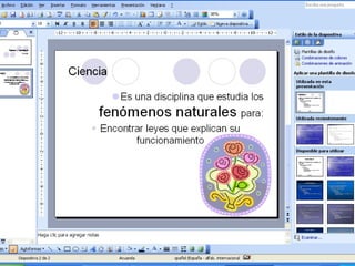 Este documento proporciona instrucciones sobre cómo crear y personalizar presentaciones en PowerPoint. Explica cómo abrir PowerPoint, crear una nueva presentación, guardar y abrir presentaciones existentes, y trabajar con diapositivas, texto, imágenes, plantillas y efectos de animación. También cubre cómo imprimir presentaciones y cambiar entre diferentes vistas como normal, clasificador de diapositivas y presentación.