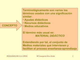 El documento habla sobre los materiales didácticos y su importancia en la educación infantil de 0 a 6 años. Explica que los materiales facilitan el proceso de enseñanza-aprendizaje a través de la estimulación del pensamiento simbólico. También clasifica los diferentes tipos de materiales y describe sus características y funcionalidad para apoyar el desarrollo cognitivo, sensorial e interacción social de los niños.
