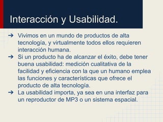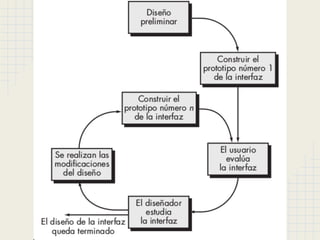 Este documento describe los principios fundamentales del diseño de interfaz de usuario. Explica que la interfaz debe ser fácil de usar, consistente y no sobrecargar la memoria del usuario. También cubre temas como el análisis de tareas, tiempos de respuesta, manejo de errores y evaluación de prototipos de interfaz. El documento concluye que una buena interfaz de usuario es crucial para que los usuarios puedan aprovechar plenamente las aplicaciones.