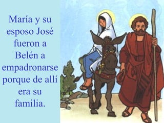 María y José viajaron a Belén para el censo del emperador y no encontraron posada, por lo que dieron a luz a Jesús en un establo. Los pastores recibieron la noticia del nacimiento de Jesús por un ángel y fueron a adorarlo, al igual que unos sabios guiados por una estrella hasta el establo.