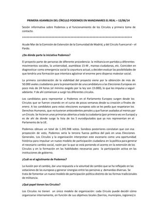 El documento resume la primera asamblea del Círculo Podemos en Manzanares el Real. Se explica que Podemos surge de diferentes movimientos sociales y que ha obtenido gran apoyo en las elecciones europeas. Los Círculos juegan un papel importante en la organización territorial y temática, y cada uno puede organizarse de manera autónoma. En la asamblea de Manzanares se acordó constituir formalmente un Círculo local y fijar una próxima reunión para establecer objetivos y tareas iniciales.