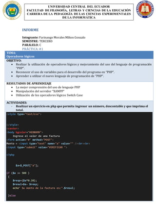 Este informe describe una práctica sobre operadores lógicos en PHP. El objetivo fue aprender a usar variables y el lenguaje PHP. Se desarrolló un programa que permite ingresar un monto y calcular el descuento aplicable según rangos de valores usando operadores lógicos y switch case. Los resultados incluyeron una mejor comprensión de PHP y el uso de XAMPP.