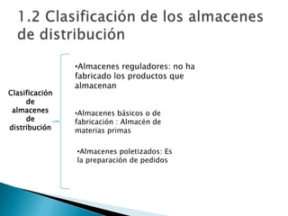 Los almacenes de distribución se clasifican en tres tipos: almacenes reguladores que almacenan pero no fabrican productos, almacenes básicos o de fabricación que almacenan materias primas, y almacenes poletizados que preparan pedidos específicos para los clientes.