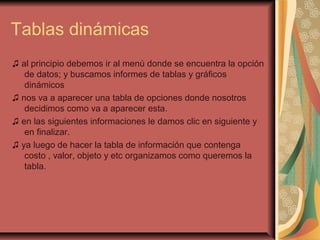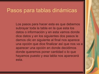 Para crear una tabla dinámica, primero se debe seleccionar la tabla de datos y luego ir a la opción "Datos" en el menú para crear un informe de tabla dinámica. Luego de configurar la tabla dinámica seleccionando las opciones deseadas, esta mostrará los datos de forma ordenada y analizable.