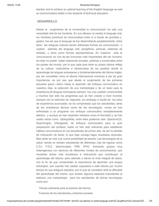 El documento describe la evolución histórica de la comunicación humana y la importancia de la comunicación en la actualidad. Explica que el objetivo es diseñar una metodología para mejorar la enseñanza del inglés mediante un enfoque comunicativo. Propone un libro de texto dividido en 12 unidades con diferentes secciones como tareas, ejercicios y juegos para practicar las cuatro habilidades del idioma de manera amena. Al aplicar esta metodología, los estudiantes mejoraron su comunicación en inglés y motivación para aprender el idioma