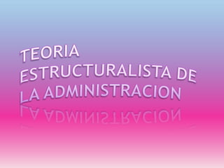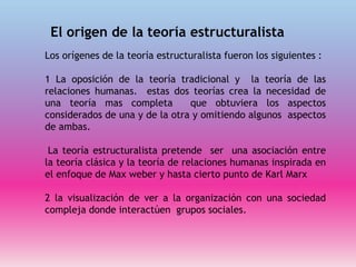 El documento describe los orígenes y desarrollo de la teoría estructuralista. 1) Surgió de la oposición entre la teoría clásica y la teoría de las relaciones humanas, buscando integrar aspectos de ambas. 2) Ve a las organizaciones como sociedades complejas donde interactúan grupos. 3) Se vio influenciada por el estructuralismo en otras ciencias, como la antropología y la lingüística.