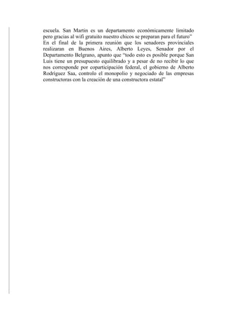 Los senadores provinciales de San Luis se reunieron en Buenos Aires con representantes de ONG, comerciantes y agrupaciones políticas para difundir el modelo de gobierno de San Luis y apoyar la candidatura presidencial de Alberto Rodríguez Saa. Los senadores discutieron los logros de San Luis a pesar de la falta de apoyo de la nación, incluyendo la solución de problemas de agua e infraestructura, educación accesible para todos los niños, y un presupuesto equilibrado gracias al control estatal de las empresas constructoras.