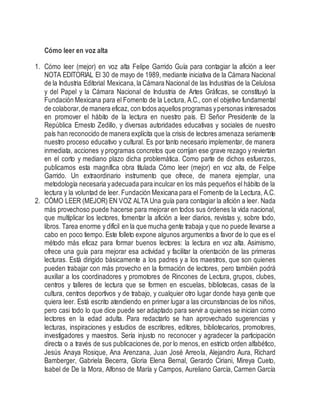 Este documento proporciona instrucciones sobre cómo leer en voz alta de manera efectiva para fomentar el hábito de la lectura. Explica que leer en voz alta es el método más eficaz para formar buenos lectores y ofrece una guía con una metodología para mejorar esta actividad. Recomienda que padres, maestros y promotores de lectura dediquen 15 minutos diarios a leer en voz alta con niños, estudiantes y otros, no solo para estudiar sino por placer, para contagiar el amor por la lectura