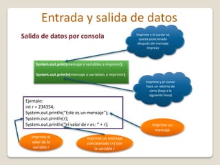 El documento describe los métodos para la entrada y salida de datos en Java, incluyendo el uso de System.out.println() para imprimir datos por consola, BufferedReader y readLine() para leer datos de la consola, y JOptionPane para mostrar ventanas emergentes y leer datos de forma gráfica. Se explica cómo convertir los datos leídos a los tipos primitivos correspondientes como int o double.