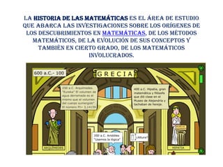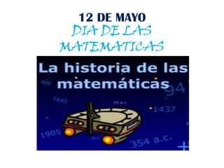 El documento habla sobre el Día de las Matemáticas y proporciona información sobre la historia de las matemáticas, incluyendo los orígenes de los descubrimientos matemáticos, métodos y conceptos a través del tiempo, así como algunos de los matemáticos más importantes como Pitágoras, Arquímedes y Einstein. También menciona las "matemáticas extremas".