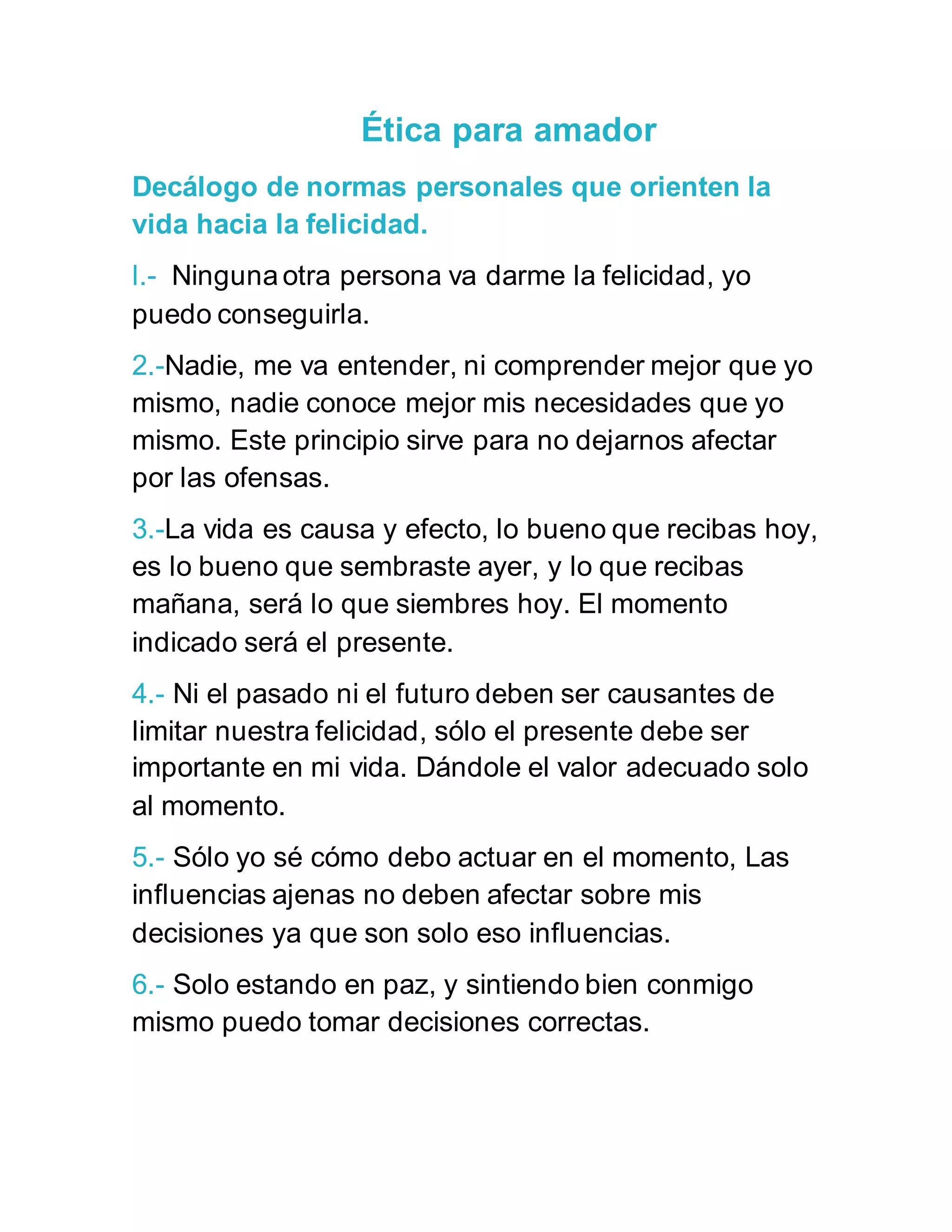 El documento presenta un decálogo de 10 normas personales para orientar la vida hacia la felicidad. Las normas incluyen que uno mismo es responsable de su propia felicidad, que nadie puede entender mejor las propias necesidades que uno mismo, y que las acciones del presente determinan el futuro.