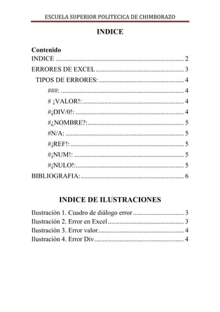 Este documento describe los diferentes tipos de errores que pueden ocurrir en Excel. Explica 8 tipos de errores comunes (# ###, #¡VALOR!, #¡DIV/0!, #¿NOMBRE?, #N/A, #¡REF!, #¡NUM!, #¡NULO!) y proporciona ejemplos e ilustraciones de cada uno. También incluye un índice e índice de ilustraciones.