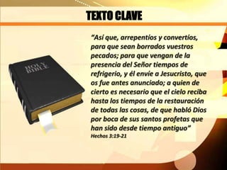 El documento resume las enseñanzas bíblicas sobre la segunda venida de Cristo. Explica que Cristo actualmente ministra en el santuario celestial, llevando a cabo la obra del juicio investigador. Cuando esta obra termine, se derramará el Espíritu Santo sobre la tierra y comenzarán las últimas plagas. Finalmente, Cristo regresará visiblemente para resucitar a los muertos, transformar a los creyentes vivos y llevar a todos a la inmortalidad celestial.