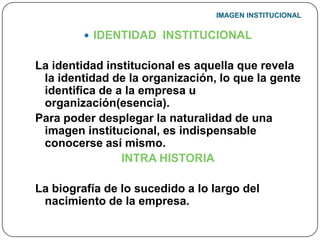 La identidad institucional revela la esencia de una organización y lo que la gente la identifica. Para desplegar una imagen institucional natural, es indispensable conocer la propia identidad de la organización. La comunicación institucional estratégica busca convertir la imagen institucional en extensión lógica de la identidad a través de tácticas comunicacionales. La comunicación organizativa establece comunicaciones institucionales productivas entre la organización y sus públicos.