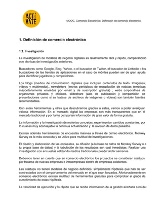 El documento describe varias herramientas y técnicas para la investigación de modelos de negocio digitales y comercio electrónico. Señala que buscadores como Google y herramientas como blogs, newsletters y presentaciones de SlideShare pueden utilizarse para identificar jugadores, competidores y tendencias del mercado. También menciona que las encuestas masivas a través de correo electrónico y herramientas como Monkey Survey permiten realizar investigaciones de mercado de forma rápida y con resultados casi inmediatos. Finalmente, indica que en el comerc