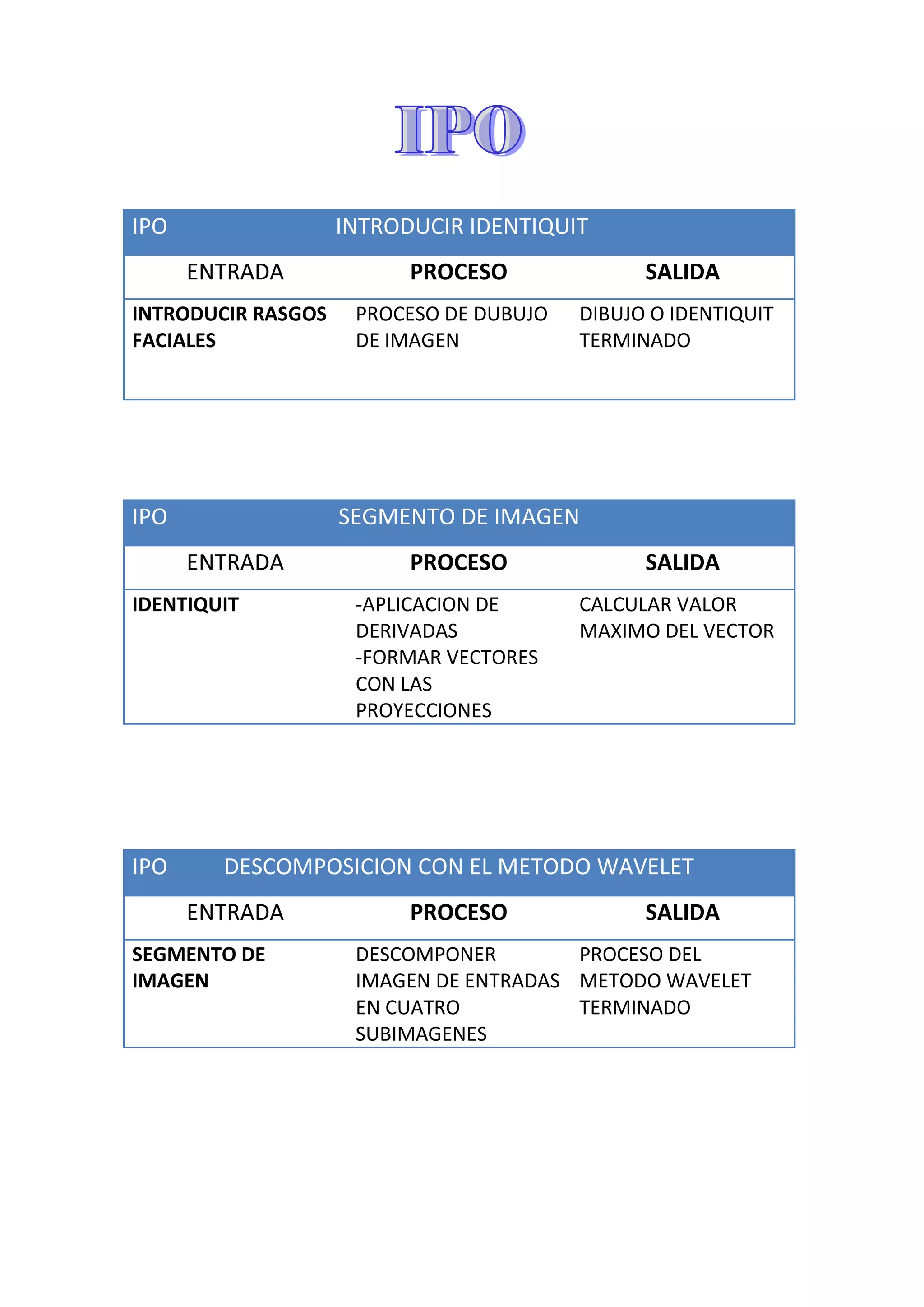 El documento describe el proceso de identificación facial mediante el uso de diferentes técnicas de procesamiento de imágenes como la segmentación de imágenes, descomposición wavelet, análisis de componentes principales y comparación con bases de datos. El objetivo es introducir una imagen facial, procesarla y compararla con bases de datos policiales para identificar posibles sospechosos.