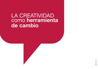 El documento presenta un taller sobre cómo la creatividad puede ser utilizada como una herramienta de cambio en los negocios, ayudando a desarrollar la capacidad creativa y detectar oportunidades. Está dirigido a empresarios, emprendedores y formadores, con el objetivo de mejorar la comunicación y soluciones en el ámbito comercial. Rocío Bustos, licenciada en publicidad, facilita el taller, que se enfoca en aplicar técnicas creativas a desafíos empresariales cotidianos.