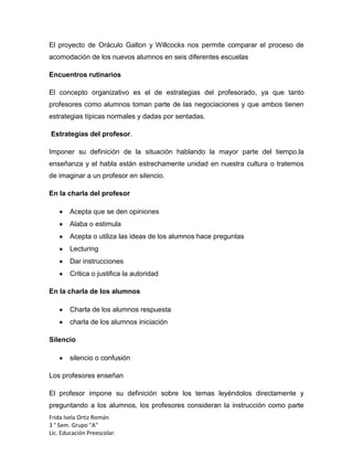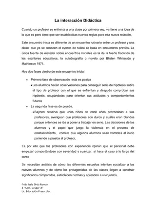 El documento describe el proceso de interacción didáctica entre profesores y alumnos, incluyendo las dos fases iniciales de observación y prueba por parte de los alumnos. También discute las estrategias de profesores y alumnos, y diferentes sistemas para analizar la interacción en el aula como el sistema de Flanders.