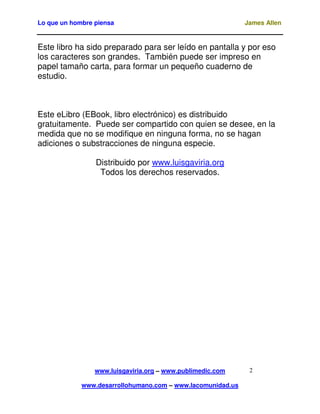 Este documento resume un libro titulado "Como el hombre piensa" de James Allen. Explica que los pensamientos de una persona moldean su carácter y circunstancias de vida, de manera que cada persona atrae a su vida aquello en lo que piensa. Las circunstancias externas son un reflejo del estado interno de la mente. Al cultivar pensamientos positivos, una persona puede crear un entorno positivo y alcanzar sus más altas aspiraciones; mientras que los pensamientos negativos atraen resultados negativos. El documento también incl