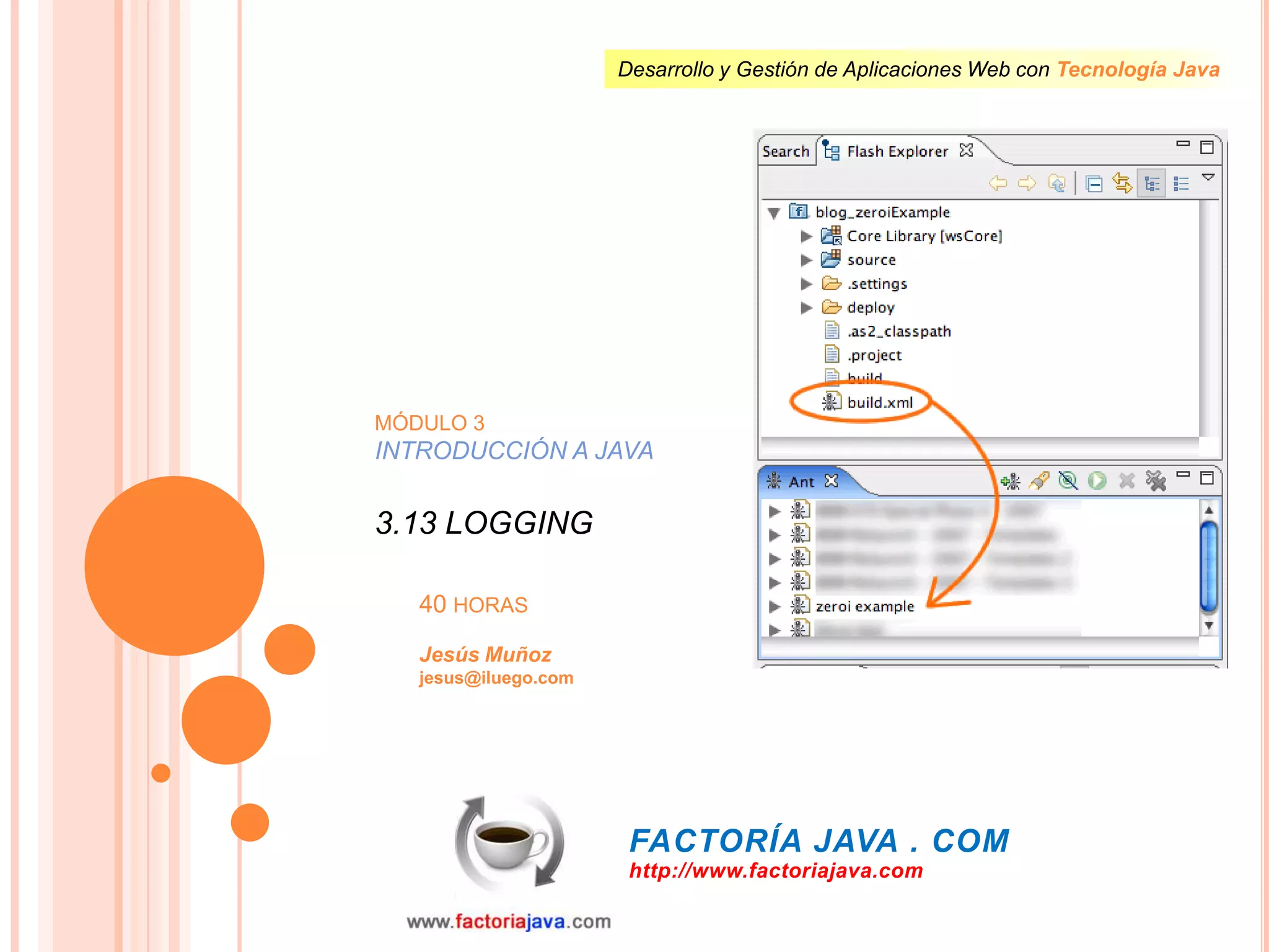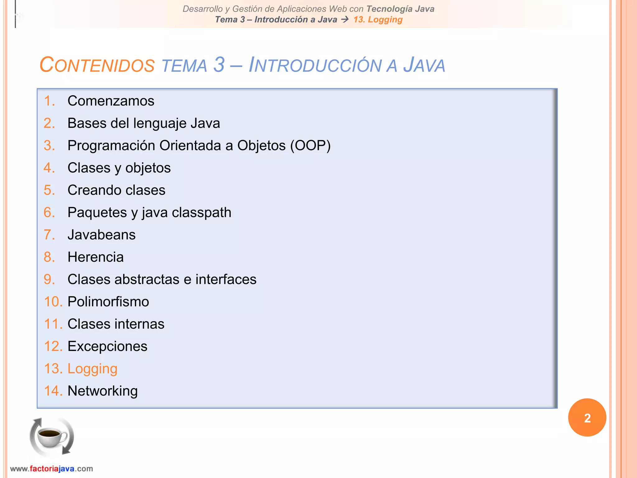 Este documento presenta una introducción al lenguaje de programación Java, enfocándose en el concepto de logging y su arquitectura. Se describe cómo Java utiliza el paquete java.util.logging para gestionar registros de eventos, errores y otros datos relevantes, facilitando el mantenimiento de aplicaciones. Además, menciona el uso de frameworks de logging como log4j que son más populares en la actualidad.