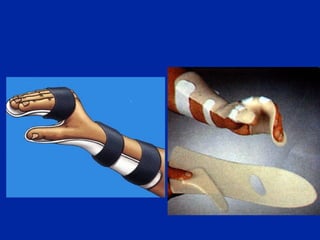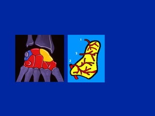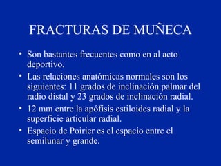 El documento describe diferentes tipos de fracturas en la muñeca, incluyendo fracturas del radio distal, fractura de Pouteau-Colles, fractura de Barton, y fractura del escafoide. Explica los mecanismos de lesión, clasificaciones, signos y síntomas, y opciones de tratamiento quirúrgico y no quirúrgico para cada tipo de fractura.