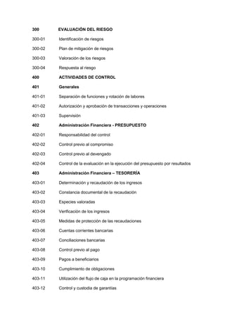Este documento presenta las nuevas Normas de Control Interno para las entidades del sector público y personas jurídicas de derecho privado que dispongan de recursos públicos en Ecuador. Las normas actualizadas incluyen 409 reglas agrupadas en secciones como administración financiera, talento humano, tecnología de la información y administración de proyectos, y siguen el marco de control interno del COSO. El objetivo es mejorar los sistemas de control y la gestión pública en relación al uso de recursos estatales y los objetivos institucionales