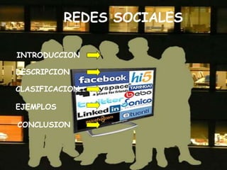 El documento describe las redes sociales, incluyendo su definición, ejemplos como Facebook, Twitter y Hi5, y su conclusión. Define las redes sociales como estructuras sociales representadas por gráficos donde los nodos son individuos y las aristas son las relaciones entre ellos. Luego proporciona detalles sobre algunas de las redes sociales más populares y concluye que las redes sociales permiten ampliar los círculos sociales pero deben usarse de manera responsable.