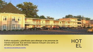 Este documento describe diferentes tipos de establecimientos de hospedaje. Incluye hoteles, moteles, hoteles residenciales, hoteles de paso, hoteles de vacaciones, hoteles hacienda, hoteles históricos, hoteles balnearios, hoteles metropolitanos, hoteles boutique, apartamentos, casas de huéspedes, campos turísticos, albergues juveniles, refugios y cabañas. Cada uno se caracteriza por sus servicios, ubicación, clientela y otros factores.