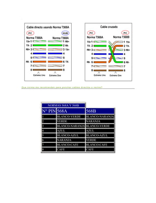 Este documento explica las dos normas más comunes para cableado estructurado de redes, la EIA/TIA-568A y la EIA/TIA-568B. Describe cómo crear un cable cruzado siguiendo una norma en un extremo y la otra en el otro extremo para conectar dos computadores. También explica cómo crear un cable directo siguiendo la misma norma en ambos extremos para conectar un computador a un switch o hub.