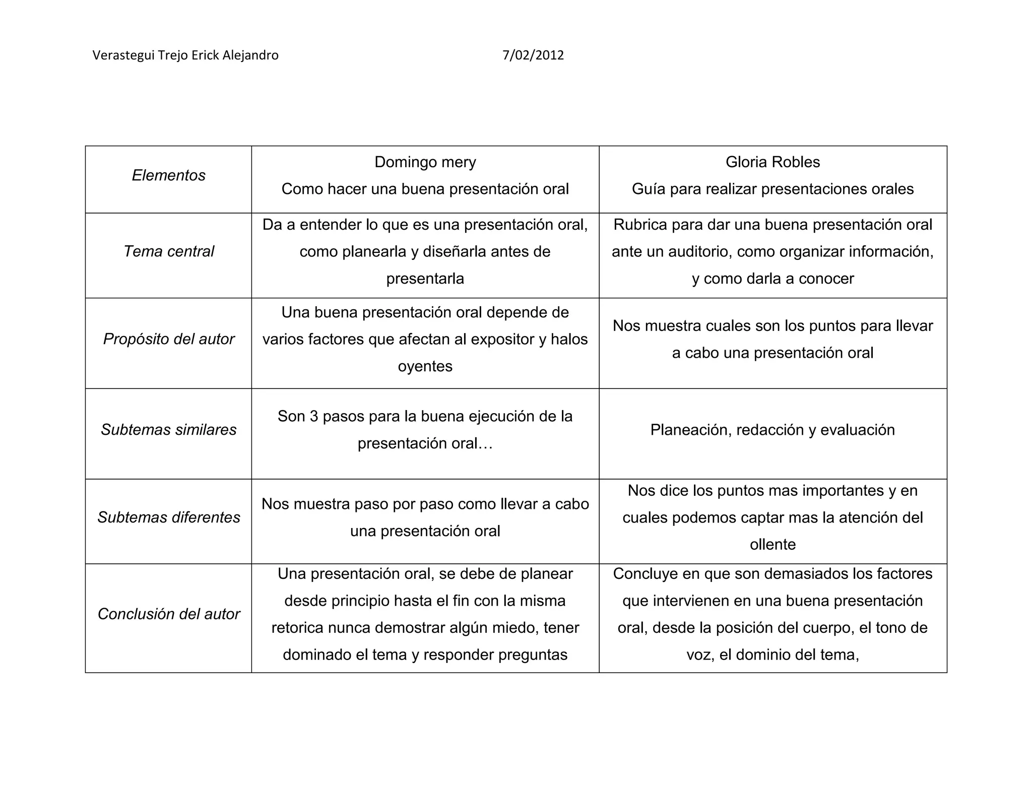 Este documento resume y compara dos textos sobre cómo dar presentaciones orales efectivas. Ambos textos discuten los pasos clave para planificar, organizar e implementar una presentación oral, como la planeación, redacción y evaluación. Sin embargo, uno de los textos es más simple y falto de detalles, mientras que el otro texto explica los temas más ampliamente y proporciona más herramientas útiles.