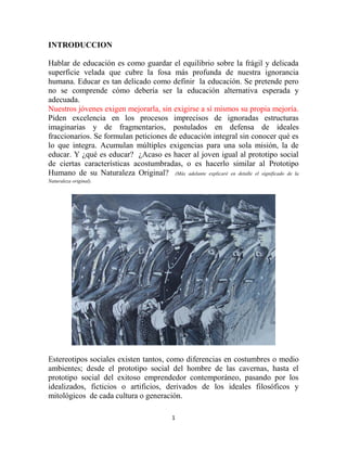 El documento explora los desafíos y conceptos fundamentales de la educación de adolescentes, criticando los estereotipos sociales y la falta de un modelo claro de educación que desarrolle el potencial humano genuino. Se argumenta que la educación actual no fomenta la responsabilidad ni la libertad, sino que promueve una competencia egoísta y artificial. Se plantea la necesidad de redefinir la educación para que se centre en la realización del ser humano auténtico, más allá de las métricas académicas tradicionales.