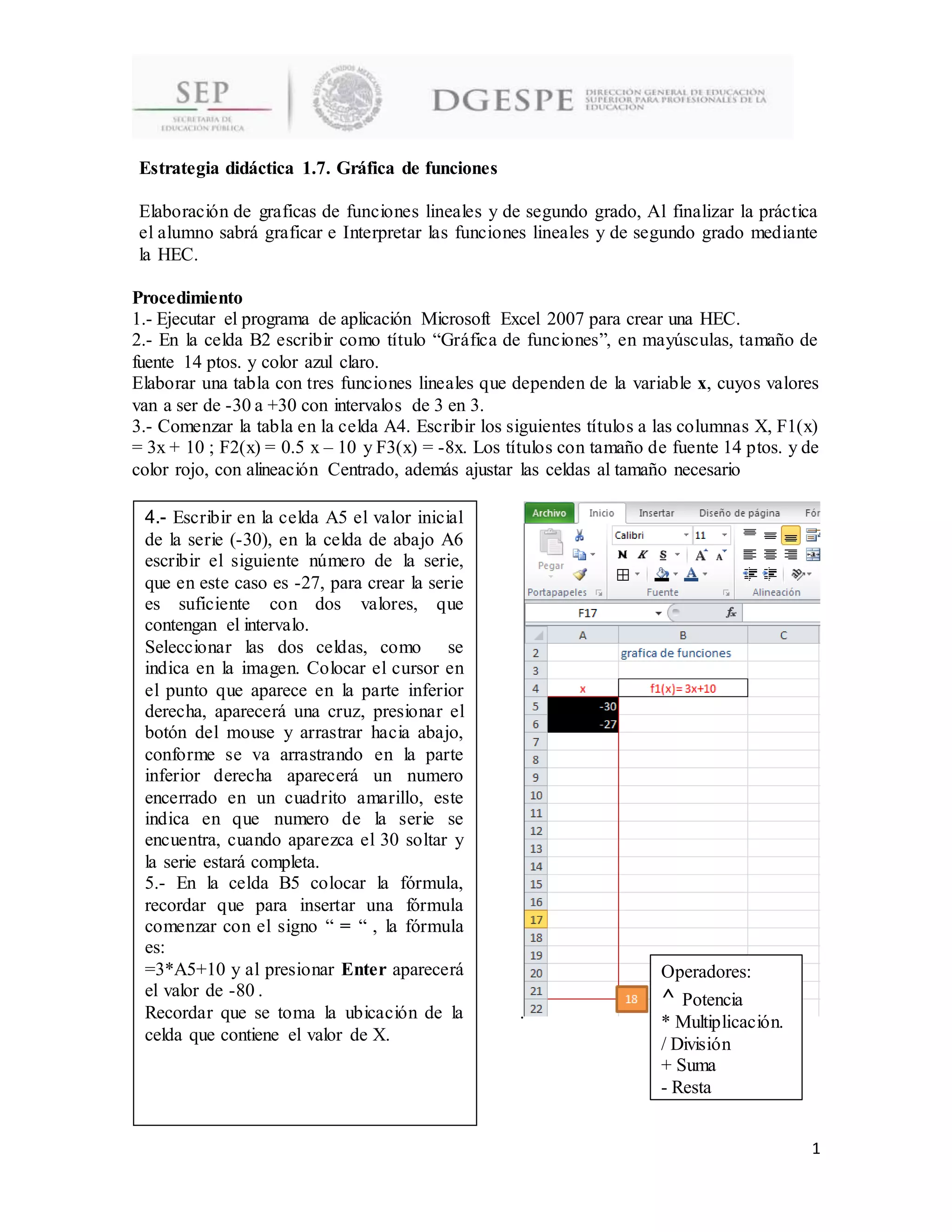 Este documento proporciona instrucciones para graficar funciones lineales y cuadráticas utilizando Microsoft Excel. Describe cómo crear tablas de datos con valores de x e y para funciones específicas, y cómo usar esos datos para generar gráficas individuales y combinadas de las funciones. También explica cómo personalizar las gráficas y determinar parámetros como el vértice y eje de simetría para funciones cuadráticas. El objetivo es que los estudiantes aprendan a representar gráficamente funciones y extraer información de las