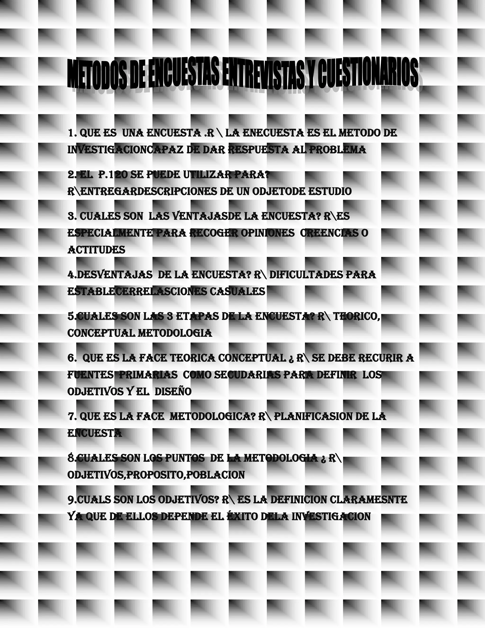 Este documento resume las características y etapas de una encuesta. Una encuesta es un método de investigación que puede responder a un problema mediante la recopilación de opiniones, creencias o actitudes de una población bien definida. Las tres etapas principales de una encuesta son la teórica-conceptual, la metodológica y la aplicación, en la cual se diseña y aplica un cuestionario para recopilar datos relevantes al objetivo de la investigación.