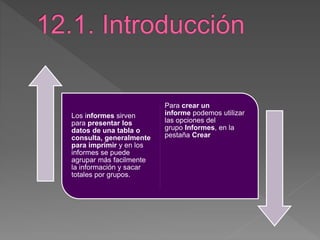 Los informes sirven para presentar datos de una tabla o consulta de forma agrupada e imprimible. Se pueden crear informes automáticamente a partir de una tabla o consulta seleccionada, diseñar informes en blanco incorporando objetos, abrir informes en blanco en modo presentación, o usar un asistente para guiar la creación paso a paso. El primer paso es seleccionar la tabla o consulta de donde se obtendrán los datos para el informe.