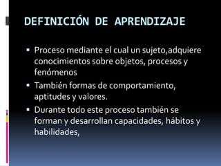 El documento define y contrasta diferentes tipos de aprendizaje. Define el aprendizaje como un proceso mediante el cual se adquieren conocimientos, habilidades y valores. Describe el aprendizaje estratégico como aquel que promueve formas flexibles de aprendizaje, mientras que el aprendizaje memorístico implica memorizar sin comprender. Finalmente, contrasta el aprendizaje memorístico, que es mecánico y de corto plazo, con el aprendizaje significativo, que facilita la retención relacionando nuevos conocim