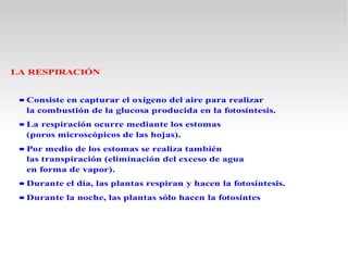 El documento describe la estructura y nutrición de las plantas. En cuanto a su estructura, las plantas están formadas principalmente por tres partes: las raíces, que fijan la planta al suelo y absorben agua y minerales; el tallo, que sostiene la planta y transporta agua, minerales y alimento; y las hojas, que fabrican el alimento a través de la fotosíntesis. En cuanto a su nutrición, las plantas producen sus propios alimentos mediante un proceso llamado fotosíntesis,