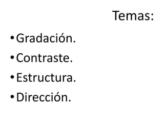 El documento presenta los integrantes del proyecto y los temas a tratar: gradación, contraste, estructura y dirección. Define la gradación como un cambio gradual ordenado que genera ilusión óptica. Explica que los módulos pueden graduarse en el plano o en el espacio y que la gradación de la figura puede ser de unión, sustracción, tensión o compresión. Define el contraste como la oposición entre elementos que permite resaltarlos y describe siete esquemas de contraste. Define la estructura como el orden entre los elementos de un dise