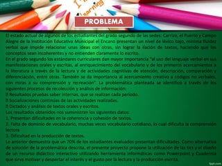 Este documento describe un proyecto para mejorar la comprensión lectora y producción escrita en estudiantes de segundo grado en tres escuelas en Pasto, Colombia. El proyecto utilizará herramientas tecnológicas como PowerPoint y Cuadernia para motivar a los estudiantes. El proyecto incluirá actividades como horas del cuento, presentaciones de fábulas y cuentos, dictados y más. El objetivo es diagnosticar y mejorar las habilidades de lectoescritura de los estudiantes.