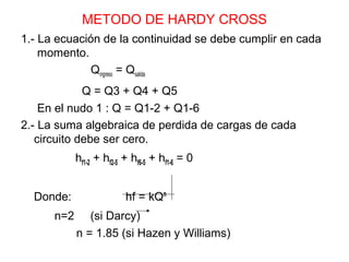 El método de Hardy Cross es un método de aproximaciones sucesivas para determinar los caudales en cada tubería y el sentido de flujo en una red de tuberías. Se basa en cumplir la ecuación de continuidad en cada nudo y que la suma algebraica de las pérdidas de carga sea cero en cada circuito. Comienza con una distribución inicial de caudales aproximada y calcula nuevos caudales iterativamente hasta que el cambio entre iteraciones sea menor al 1% del caudal.