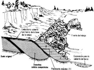 El documento aborda la problemática de los botaderos a cielo abierto y su impacto negativo en el medio ambiente y la salud pública, resaltando que su operación conlleva riesgos inadmisibles. Se presenta la necesidad de convertir estos espacios en rellenos sanitarios controlados, detallando las características, problemas y consideraciones para su saneamiento y diseño. Además, se establecen criterios y metodologías para la localización de rellenos sanitarios conforme al decreto 838 de 2005 y se discuten ventajas y desventajas de su implementación.