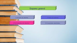 Este documento describe las características y clases de adverbios. Los adverbios son palabras invariables que expresan circunstancias como el lugar, tiempo, modo u otras. Pueden modificar verbos, adjetivos u otros adverbios. Existen adverbios simples y compuestos formados con el sufijo -mente o locuciones adverbiales. El documento clasifica los adverbios en varias categorías como lugar, tiempo, modo, cantidad, afirmación, negación y duda.