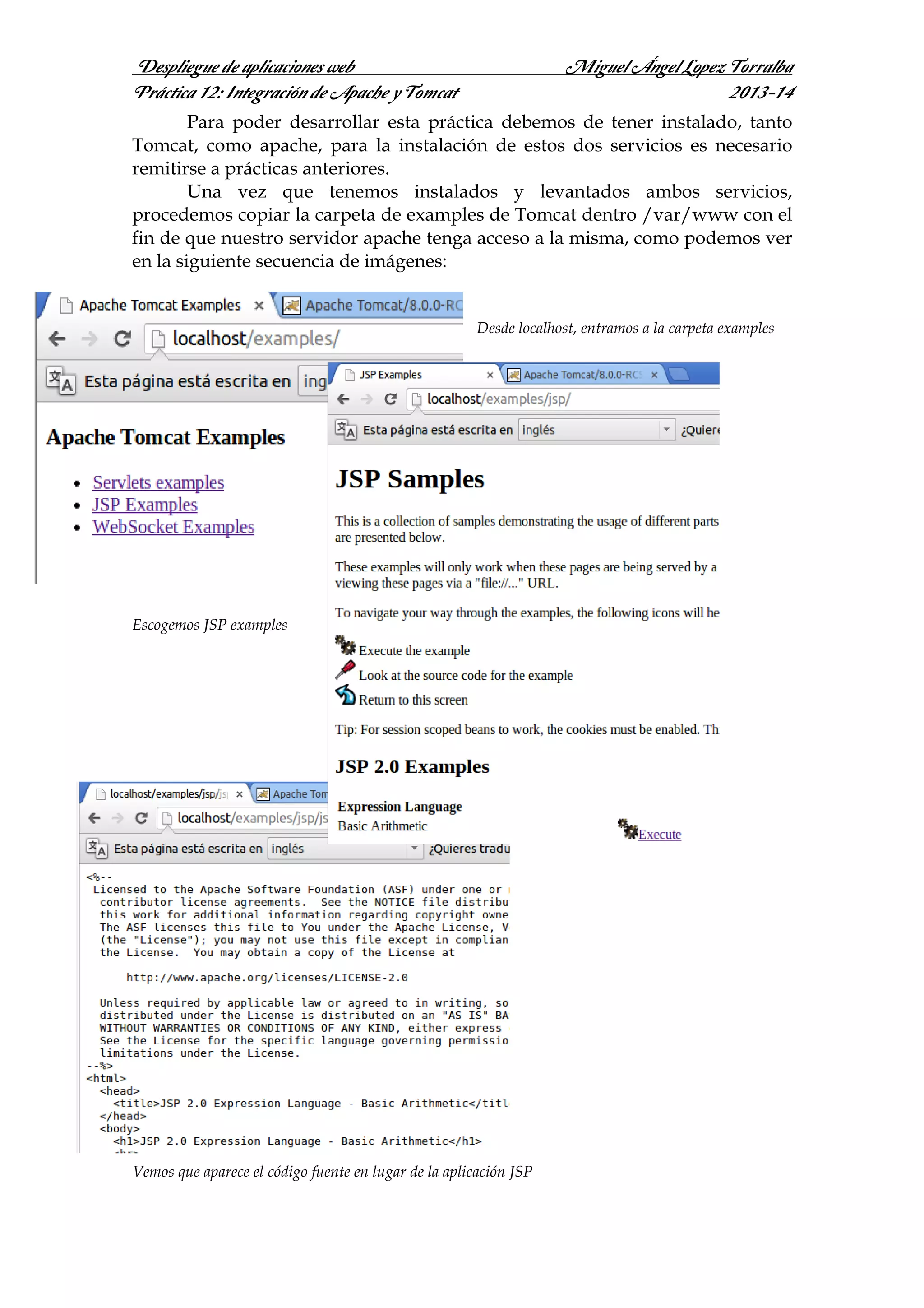 Este documento describe los pasos para integrar Apache y Tomcat mediante el módulo JK. Se instala y configura el módulo JK, se modifican los archivos de configuración server.xml, workers.properties y jk.conf, y se reinician Apache y Tomcat para que funcionen conjuntamente.