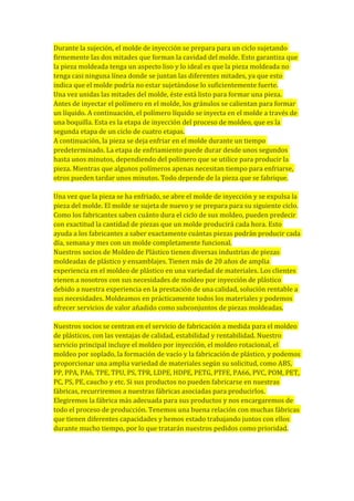 El moldeo de plástico es un proceso que permite la creación de productos plásticos mediante la inyección de polímeros en moldes, siendo fundamental para la producción de piezas necesarias en diversos negocios. La empresa presentada ofrece servicios personalizados de moldeo por inyección, rotacional y soplado, con un enfoque en calidad, eficiencia y reducción de costos, destacándose por su experiencia y capacidad técnica. Además, se enfatiza la importancia en la selección de materiales adecuados para garantizar la calidad y funcionalidad del producto final.