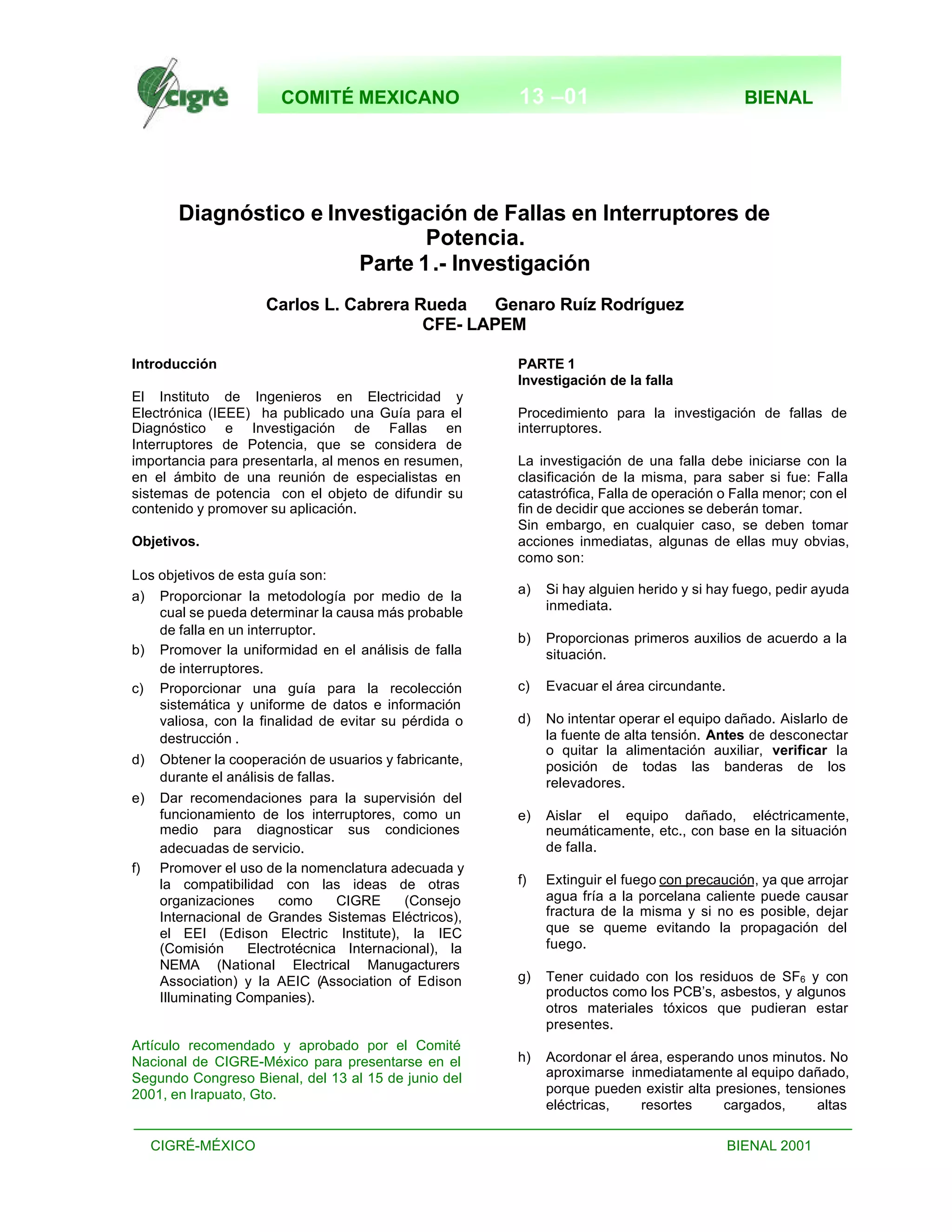 El documento proporciona un procedimiento para la investigación de fallas en interruptores de potencia. Incluye pasos como documentar la evidencia visual, entrevistar testigos, analizar registros de mantenimiento, inspeccionar partes internas y externas, y establecer una secuencia probable de la falla. El objetivo es determinar la causa de la falla y promover la uniformidad en el análisis para evitar la pérdida de información valiosa.
