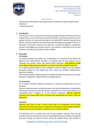 El documento explica el análisis PEST, una herramienta para identificar factores externos como políticos, económicos, sociales y tecnológicos que pueden afectar un negocio. Describe cada factor y cómo pueden crear oportunidades y amenazas. Además, proporciona pasos para realizar un análisis PEST e identificar estas influencias externas.