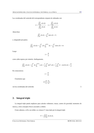 El documento habla sobre las aplicaciones del cálculo integral vectorial en física. Explica cómo se pueden definir conceptos como masa, centro de masa, momentos de inercia y promedios mediante integrales dobles, triples e integrales de línea y superficie. Además, presenta ejemplos del cálculo de estos conceptos para regiones planas y sólidos con diferentes densidades.